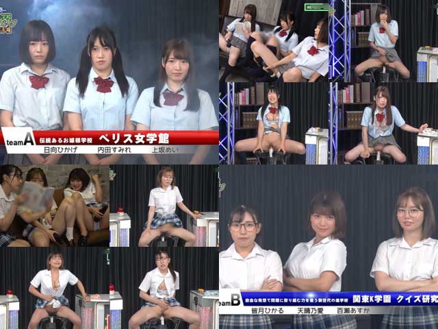 問題の映像は2024年1月に配信された「名門○校女子学生たちが激突!全国○校生ピストンバイブクイズ選手権2」という作品。学校対抗で全国の名門校に通う女子校生がピストンバイブの快感に耐えながらクイズに答えていくというエロバラエティ風AV。問題のシーンは個人戦最後、ペリス女学館の上坂めいと関東K学園クイズ研究会の皆月ひかるの対戦で2人が映っている引き映像と上坂めいのアップの映像になります。